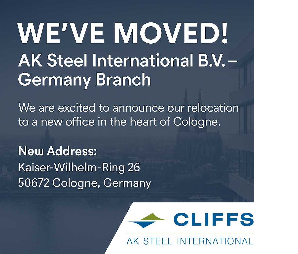 AK Steel International - Filiale tedesca si trasferisce nei nuovi uffici di Colonia