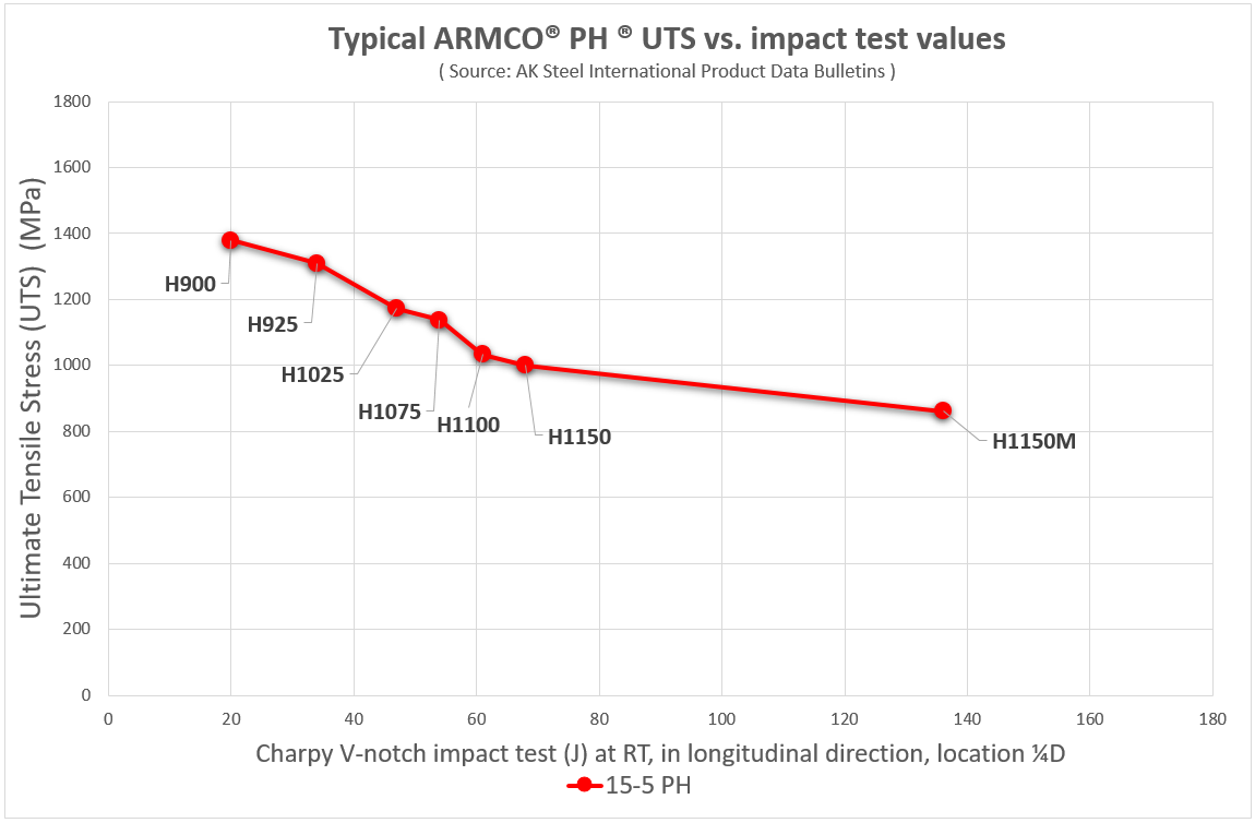 ARMCO PH 13-8 Mo si distingue in diversi aspetti, oltre al fatto di essere contrassegnato dalla sigla “PH” davanti alla designazione del grado. La sua composizione chimica richiede la fusione a induzione sotto vuoto invece della fusione ad arco elettrico, Il processo di indurimento per precipitazione si basa su NiAl intermetallici (nichel-alluminio forma i precipitati di indurimento) invece del rame. Ma il risultato è chiaro. Di seguito lo stesso grafico di prima, con l’aggiunta del PH 13-8 Mo: